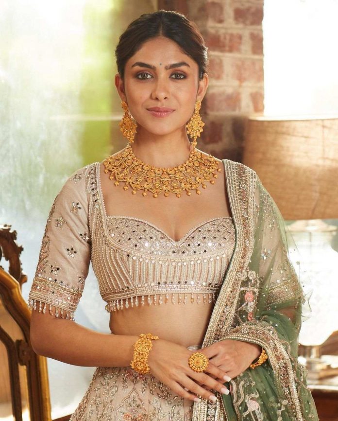Mrunal Thakur's pastel bridal lehenga in peach with green dupatta looks