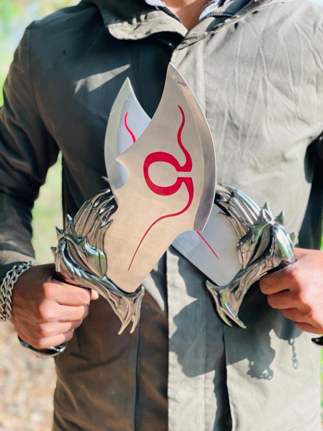 God of War Kratos "Blades of Chaos" Stainless Steel Double Blades Repl Kratos Blades For Sale The famous god of war 1:1 blades of chaos replica swords. The kratos blades of chaos are designed as a full metal construction replica weapon. The blade is cast from zinc. God of war swords kratos blades of chaos high density foam 1:1 scale props silver. These swords measure 20 inches overall and have a 12 inch blade. With display. Kratos Blades For Sale.