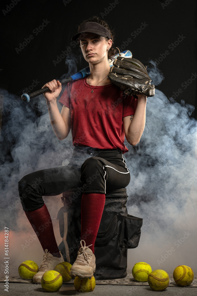 Athletic fast pitch softball player in red and black uniform sits on