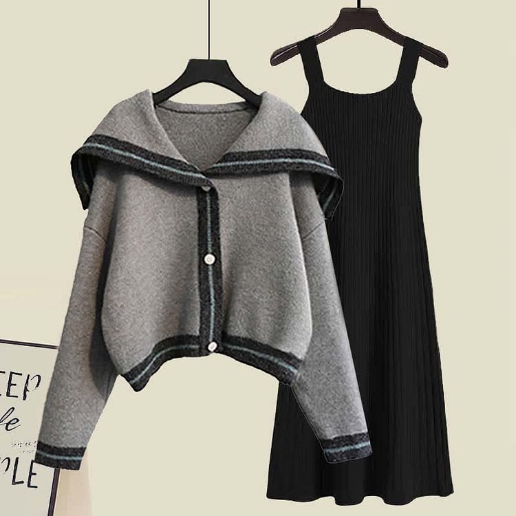 Sailor Collar Knit Cadigan Sweater Slip Dress Two Pieces Set