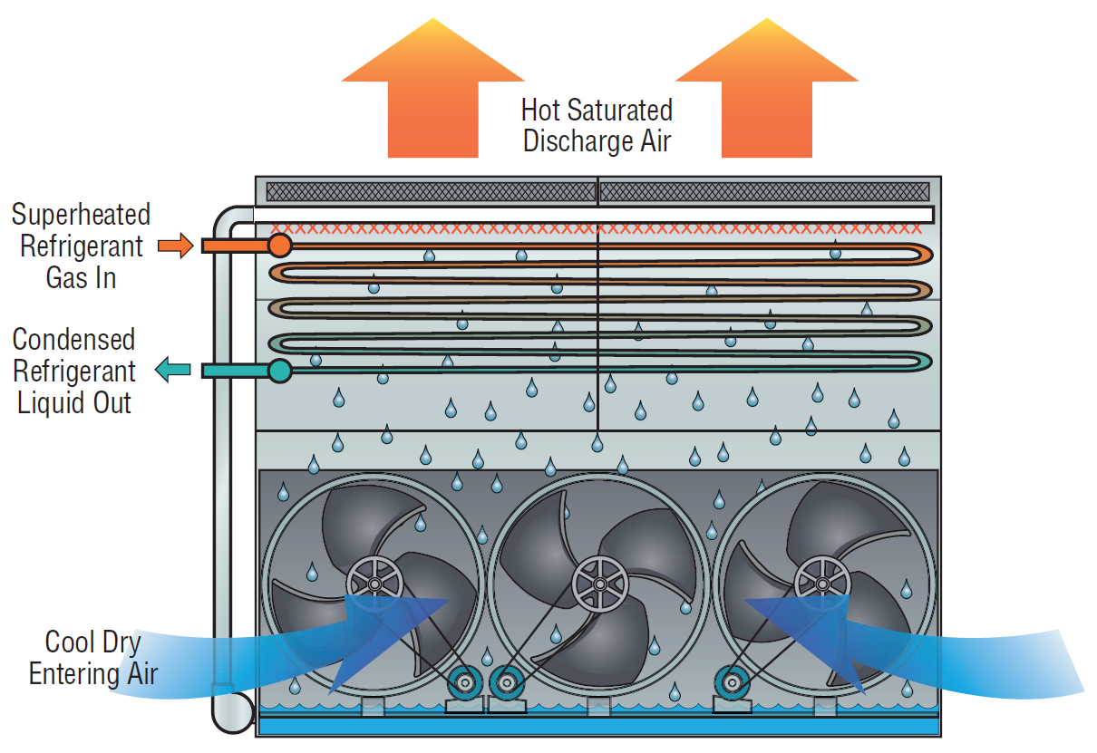 Evaporative Condensers In short, it is a type of indirect cooling, where heat of vapour refrigerant is taken by water and water is cooled by air. The evaporative condensers use both air and water as condensing mediums to condense the hot vapour refrigerant and convert it into liquid refrigerant. Keep in mind that the heat will be removed when it no longer. Evaporative Condensers.