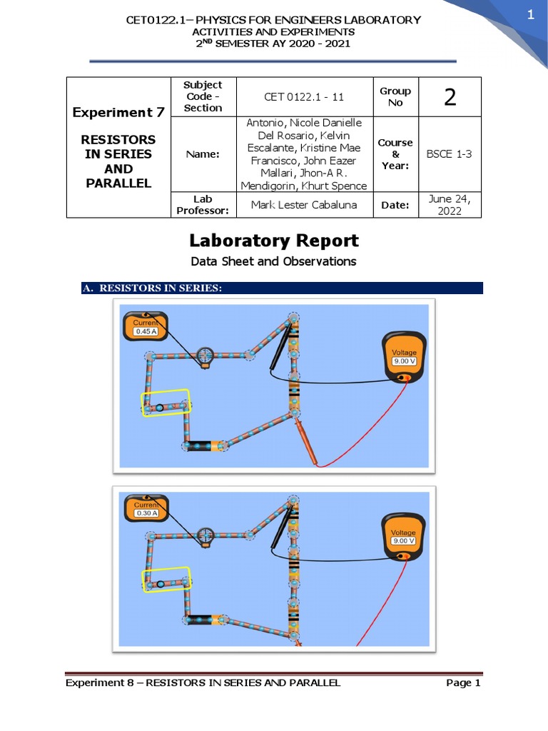 Group 2 Experiment 7 Resistors in Series and Parallel PDF Resistor Experiment Report In this lab you will perform an. the objective of this lab is to determine the resistance of several resistors by applying ohm’s law. Electrical resistance and the resistor. To explore the measurement of voltage & current in circuits. Ohm’s law is the most fundamental equation in electric circuit. the purposes of this experiment are to test ohm's. Resistor Experiment Report.