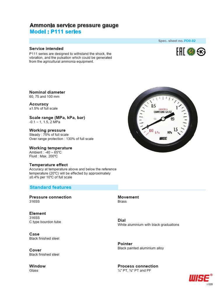 Model P111 Series Ammonia Service Pressure Gauge PDF Pressure