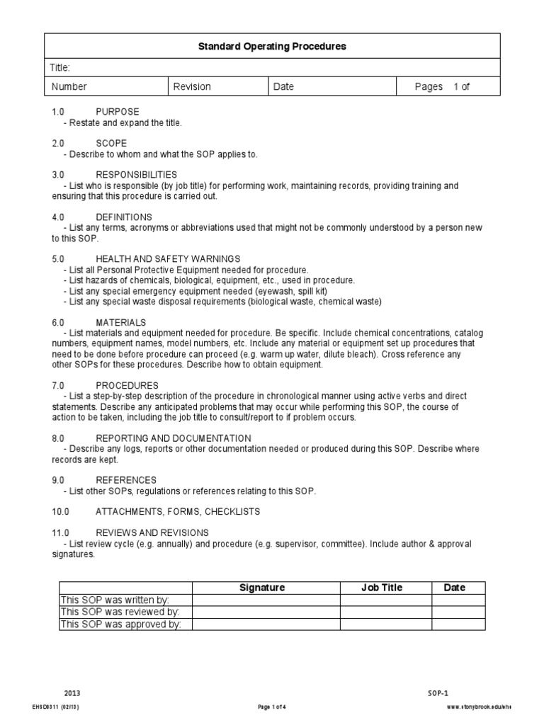 It Department Sop Template PDF Template Laboratory Sop Guidelines Purpose—include information about the test (why it is important, how it is used,. a standard operating procedure (sop) is a written document detailing how to safely work with hazardous materials or carry. a standard operating procedure (sop) is a set of instructions for performing experiments or processes that involve. sops should include the following information: this. Laboratory Sop Guidelines.