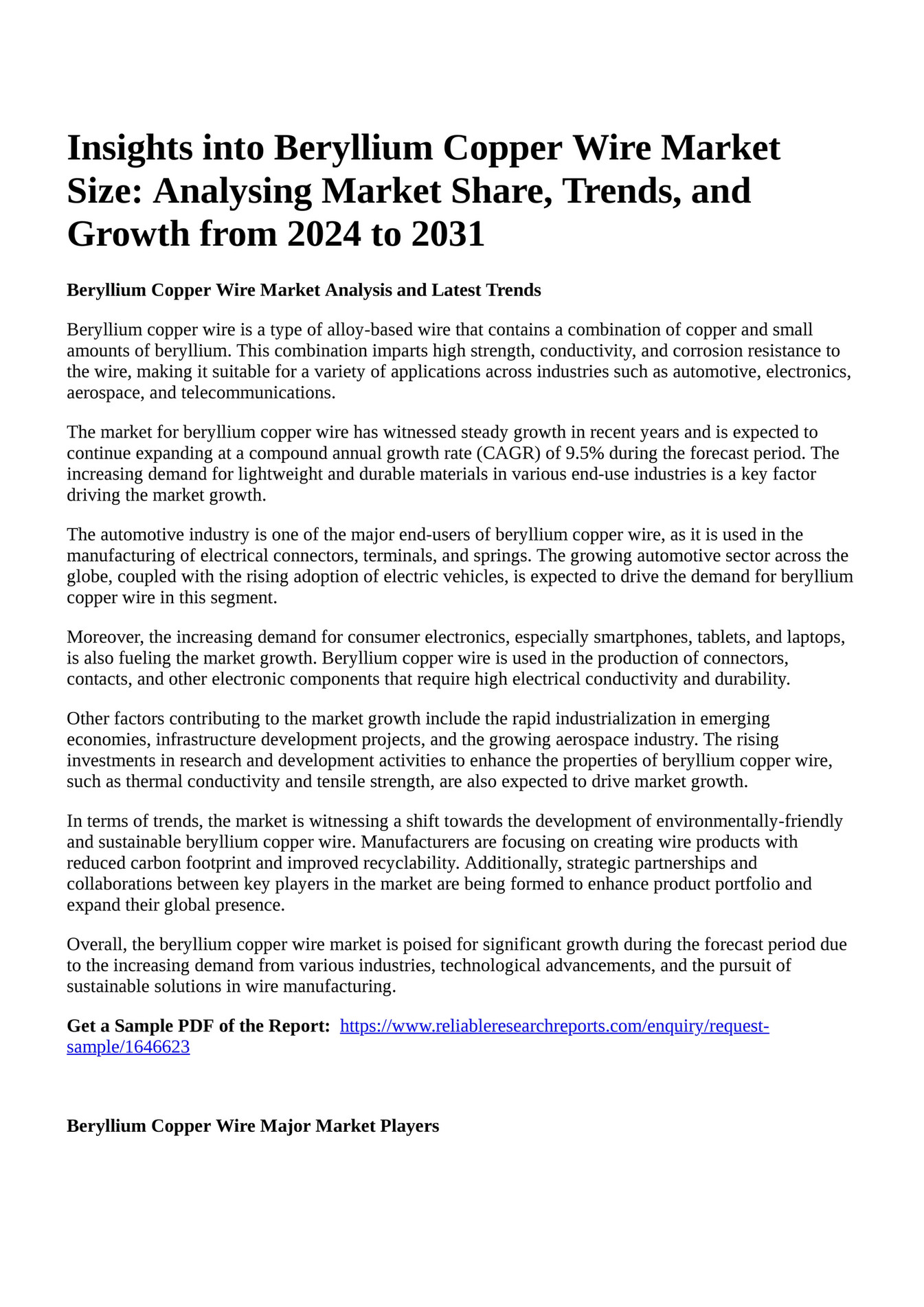 Reportprime Insights into Beryllium Copper Wire Market Size