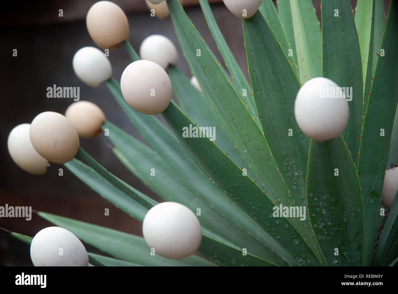Egg shells on the points of a spiky plant, Ubud, Bali, Indonesia Stock