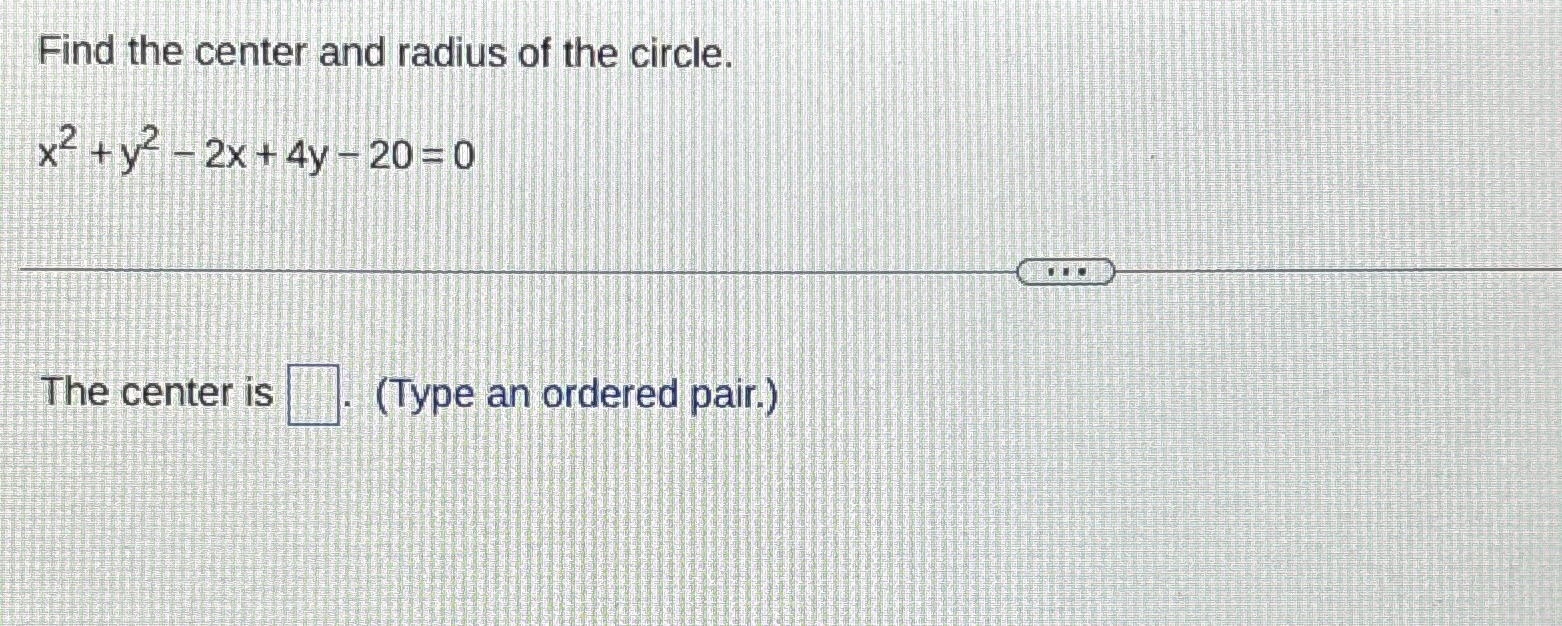 Solved Find the center and radius of the Radius Of The Circle X2+Y2+2X-4Y=20 use this form to determine the center and radius of the circle. 0 = x2+y2 −2x−4y −20. The variable r r represents the radius of the circle, h h represents the x. Given equation x 2 + 2x + y 2 + 4y = 20. Complete the square for both x and y. we will solve the given. Radius Of The Circle X2+Y2+2X-4Y=20.