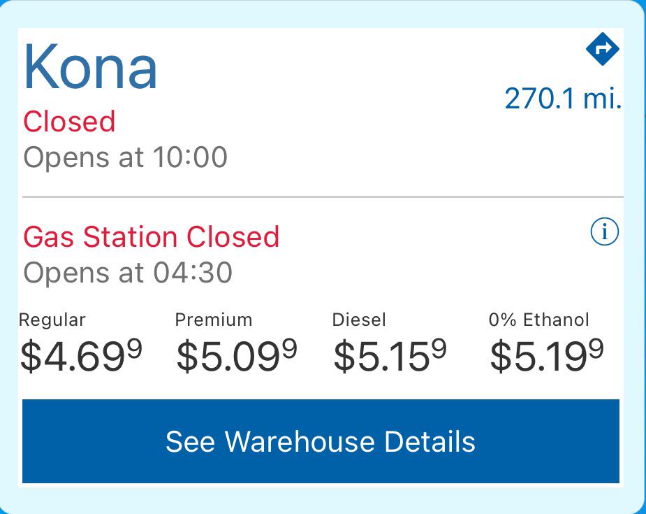 TIL that Kona’s Costco gas station opens at 430am and sells 0 ethanol