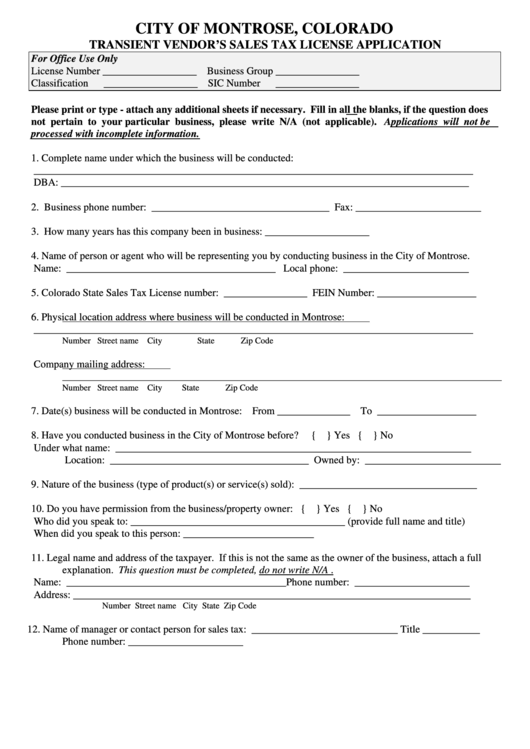 Transient Vendor'S Sales Tax License Application Form City Of Sales Tax Rate For Montrose Co Sales tax rates in montrose county are. The 8.53% sales tax rate in montrose consists of 2.9% colorado state sales tax, 1% montrose county sales tax, 3.88% montrose tax and 0.75% special. Montrose county, colorado has a maximum sales tax rate of 8.65% and an approximate population of 33,657. Tax rates are provided by avalara and updated monthly. Groceries are. Sales Tax Rate For Montrose Co.