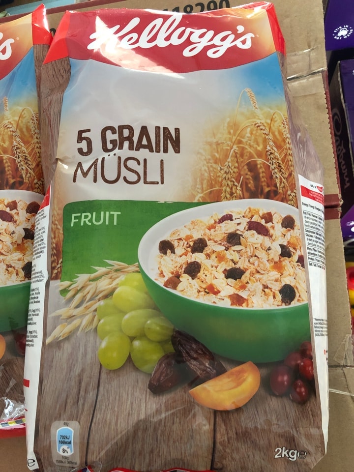 Kellogg's 5 Grain Muesli Fruit Kellogg's Kellogg's 5 Grain Muesli Kellogg's® mueslix® cereal is a delightful assortment of barley, whole grain wheat, rolled oats, raisins, dates and almonds that will mix up your morning routine. Where to buy visit our site. Made with barley, whole grain oats and wheat, with raisins, dates, and almonds. Kellogg's muesli is a delicious multigrain breakfast which has been carefully crafted for flavour and texture.. Kellogg's 5 Grain Muesli.