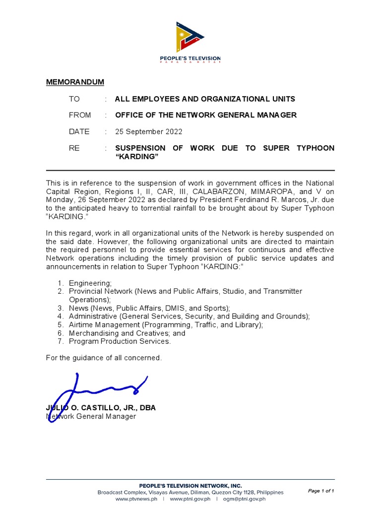 Palace suspends afternoon gov't work on April 5 ABSCBN News Work Suspension Memo One way to discipline a worker is suspension, which must be done procedurally with proper protocols. A disciplinary letter is a rap on the knuckles in the form of suspension from work for certain days, a docking of salary or withdrawal. This suspension is a result of [insert details of the incident] that occurred on [date]. A suspension letter is. Work Suspension Memo.