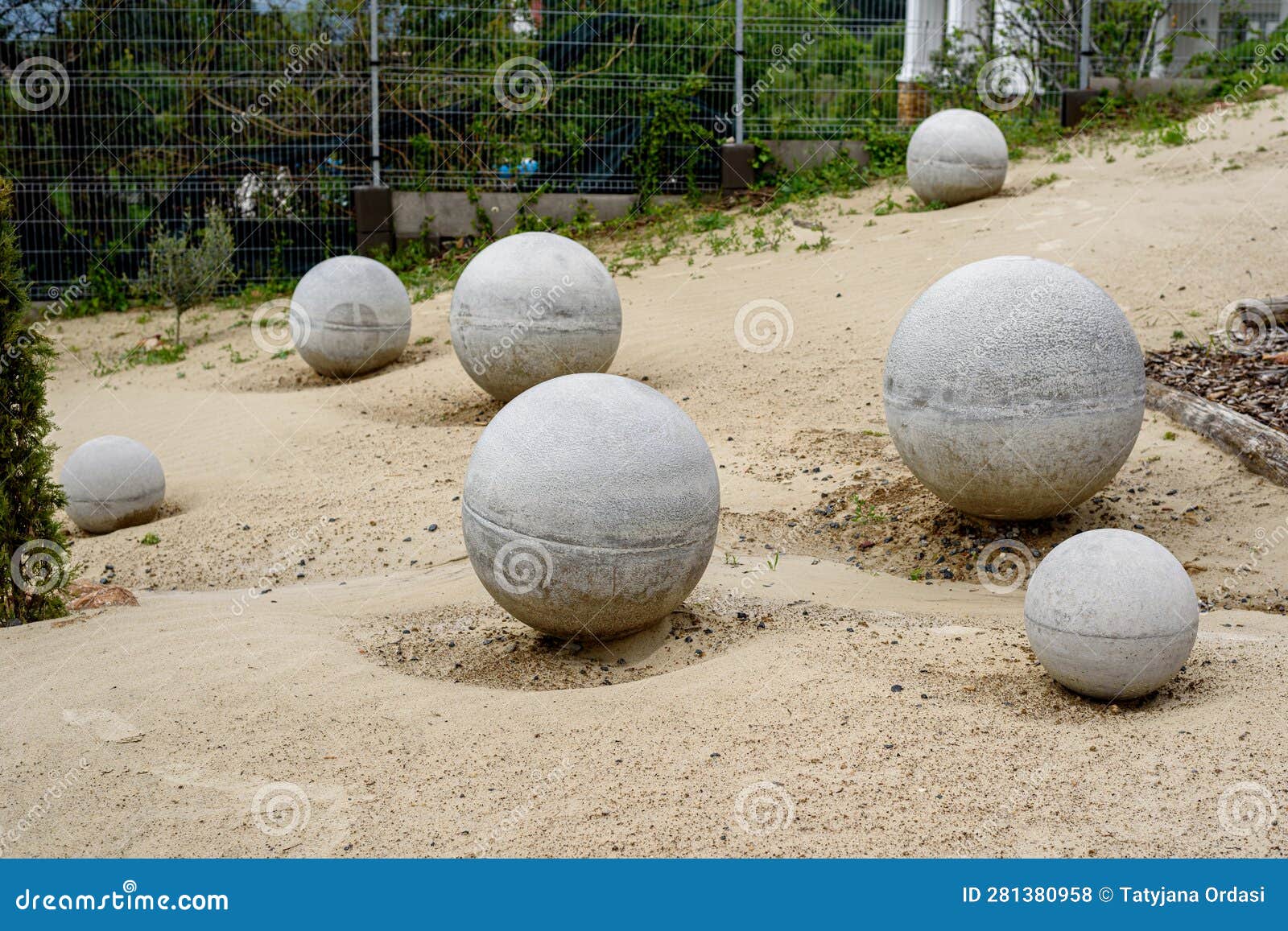 Seven Concrete Round Spheres on Sand in a Garden Stock Photo Image of