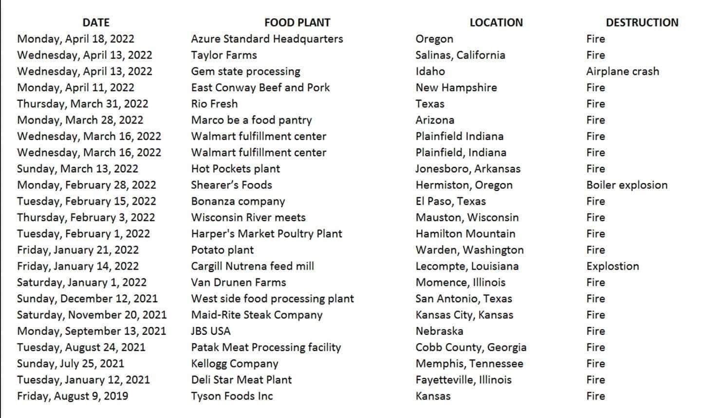 Arson A tool for the great reset? At least 16 fires at American food List Of Food Processing Plant Fires In 2022 Social media users are sharing the claim that there is a planned increase in fires at food processing plants to purposefully create. 1— 4/30/21 monmouth smithfield foods pork. Food processing plants across the country are catching on fire, many of them in the same manner. Did american food processing facilities mysteriously and suspiciously begin to catch fire after president joe. List Of Food Processing Plant Fires In 2022.