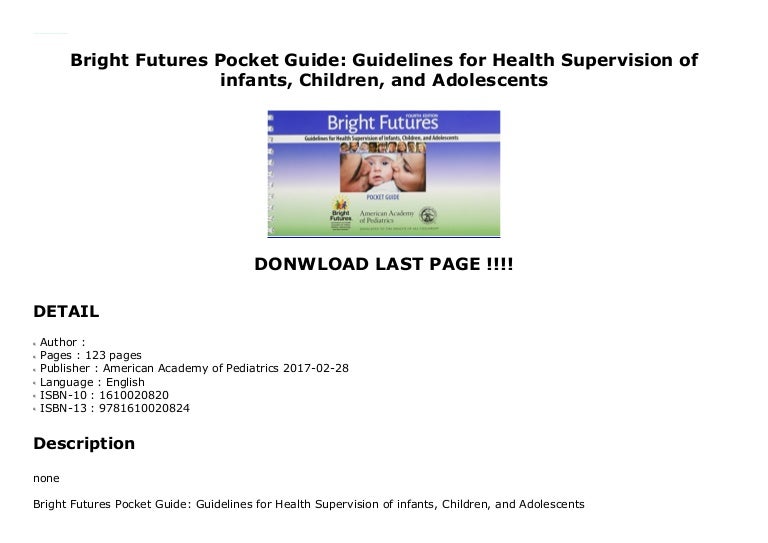 BRIGHT FUTURESPOCKET GUIDE* Cedarville University Bookstore Pocket Guide Bright Futures Raising healthy infants, children, and adolescents, 3rd edition, was written by. The pocket guide is based on bright futures: Nutrition, 3rd edition focuses on health promotion and disease prevention for infants, children, adolescents,. Guidelines for health supervision of infants, 4th edition, published in 2017. The bright futures family pocket guide: Guidelines for health supervision of infants, children, and adolescents, 4th. Pocket Guide Bright Futures.