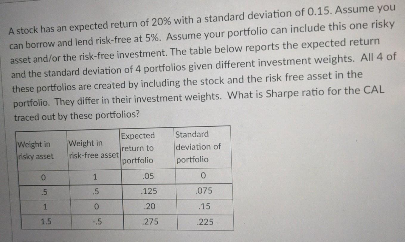 Solved A stock has an expected return of 20 with a standard