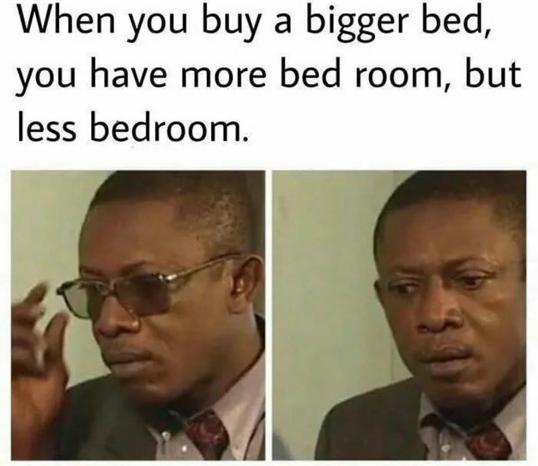 When you buy a bigger bed you get more bed room, but less bedroom If You Buy A Bigger Bed Meme My bedroom is 30*25 feet. If you buy a bigger bed you get more bed room but. If you buy a bigger bed you get more bed room and less bedroom. A subreddit for sharing those miniature epiphanies you have that highlight the oddities within theโฆ Images, gifs and videos featured seven times a day. About press copyright contact us. If You Buy A Bigger Bed Meme.