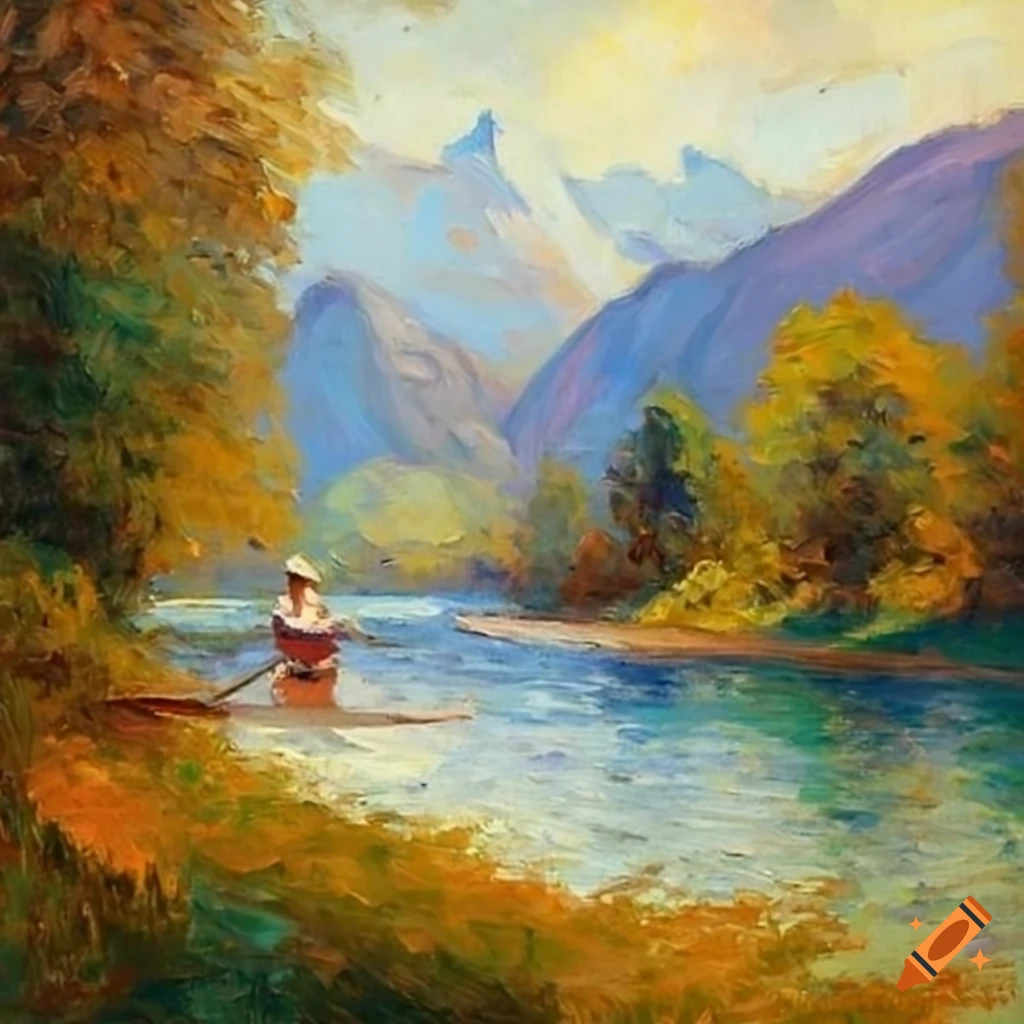 French impressionist painting of a woman rowing a boat through mountains