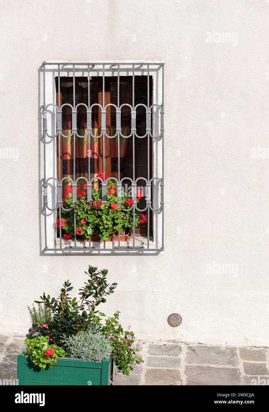Stucco wall with old window and topiary in window box Stock Photo Alamy Window Box On Stucco For exteriors with european or old world style, such as stucco, stone, or painted brick surfaces, try a wrought iron window box. If there is, drill pilot holes at the connection point markings in the stucco with the 1/8 drill bit. This old house general contractor tom silva shows how to properly mount window boxes, and this old house landscape.. Window Box On Stucco.