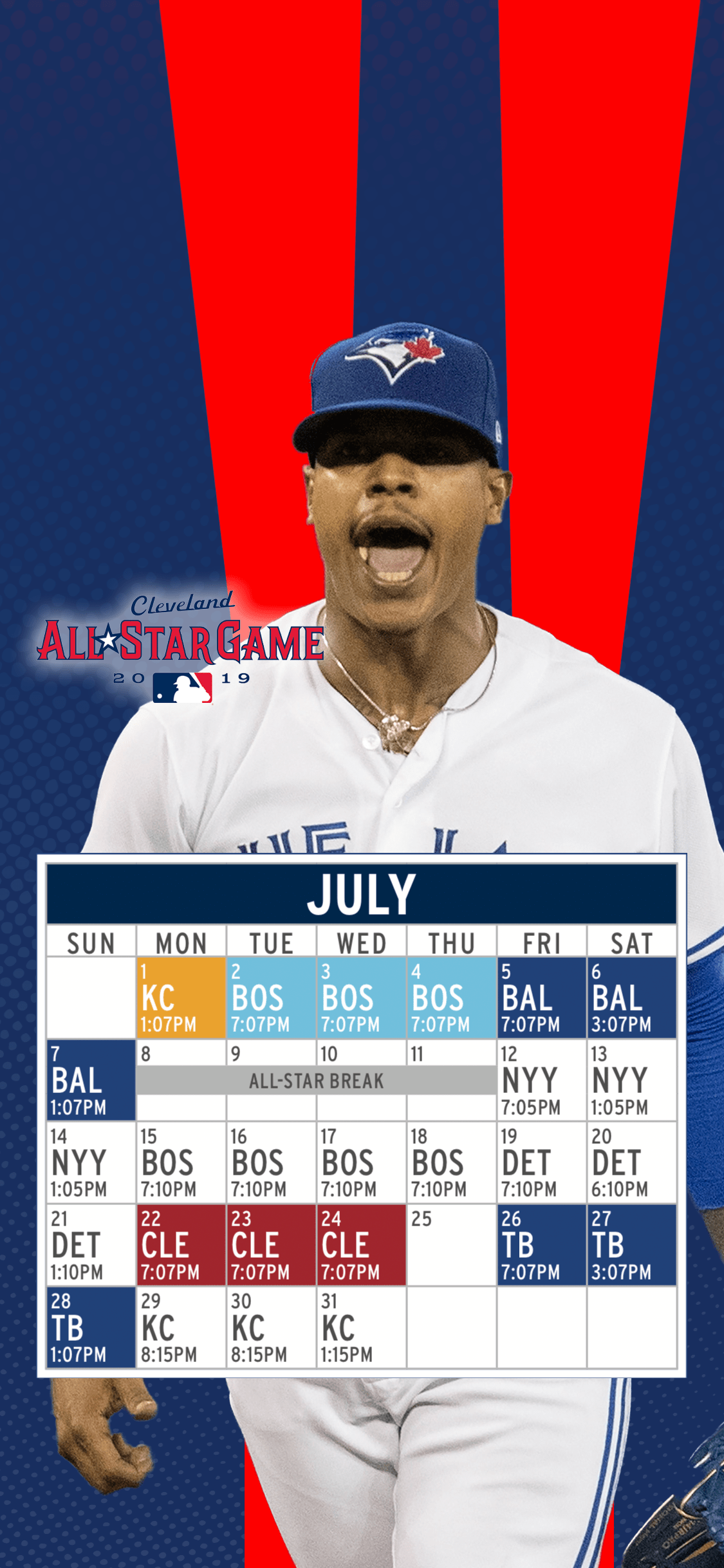 Phone Background with schedule for July 2019. Featuring the Blue Jays