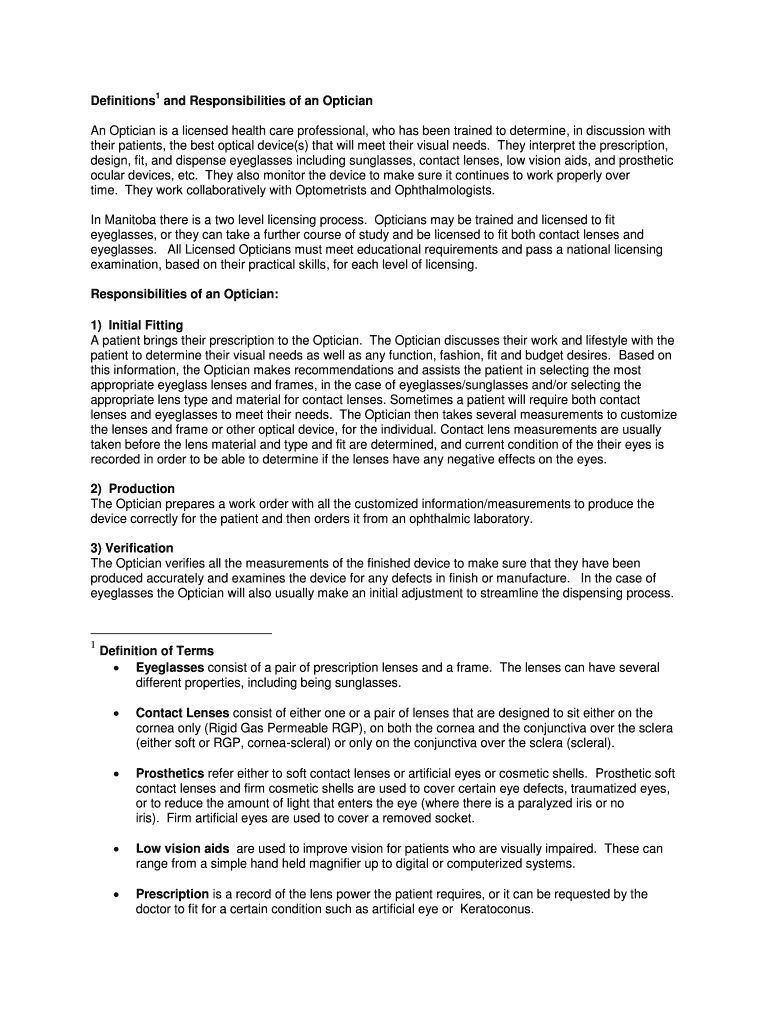 Fillable Online Definitions and Responsibilities of an Optician Fax