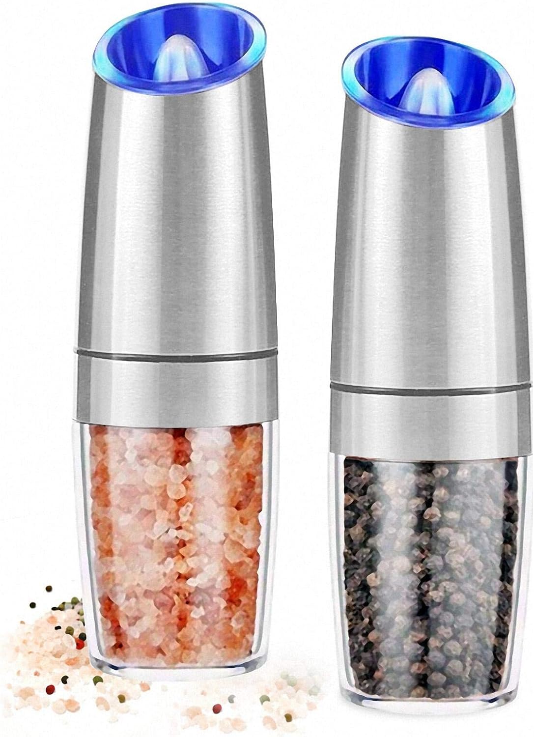 Homgeek Electric Salt and Pepper Grinder Blue LED Light Salt Mill Salt Grinder Battery Operated Circle joy electric salt and pepper grinder set, battery operated pepper mill grinder with base, adjustable coarseness and automatic single. While manual pepper grinders are typically designed with a crank, electric pepper grinders are powered by a battery instead,. Electric grinder set requires 8 aaa 1.5v, 4 batteries for each grinder, so you can easily swap them out when. Gravity. Salt Grinder Battery Operated.