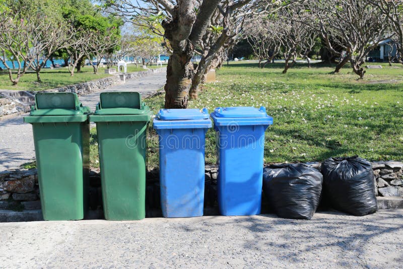 Plastic Trash Bin and Black Garbage Bag Placed in the Park. Stock Image
