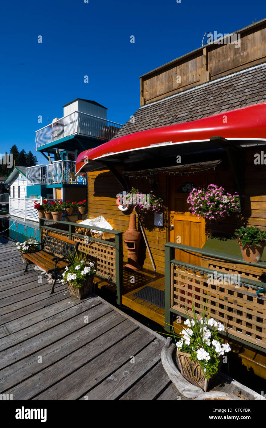 Float Homes with hanging baskets and canoe on docks at Cowichan Bay