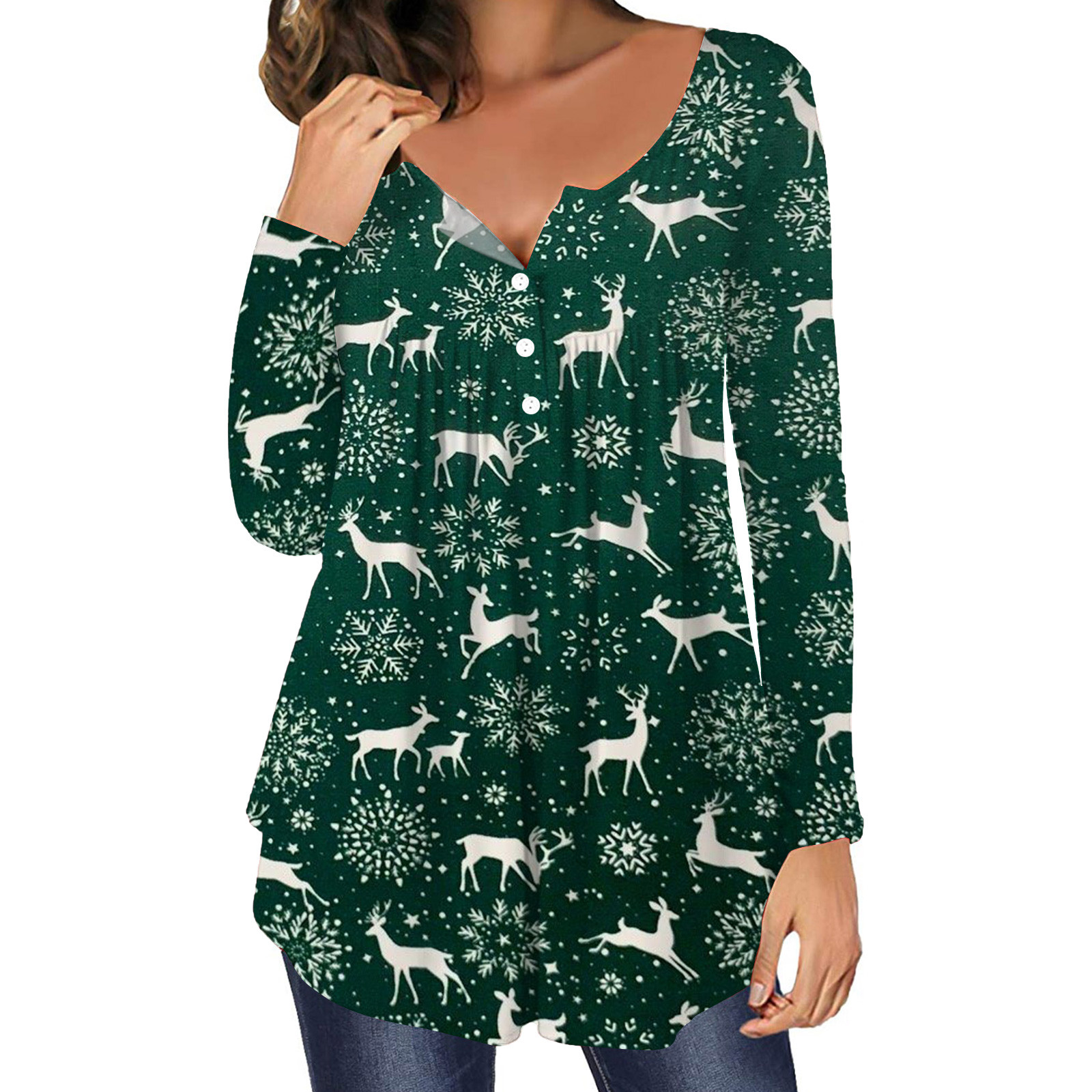 TrendVibe365 Womens Christmas Tops Long Sleeves Reindeer Ruched Xmas