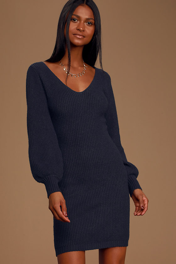 Knit Navy Blue Dress Sweater Dress Statement Sleeve Dress Lulus