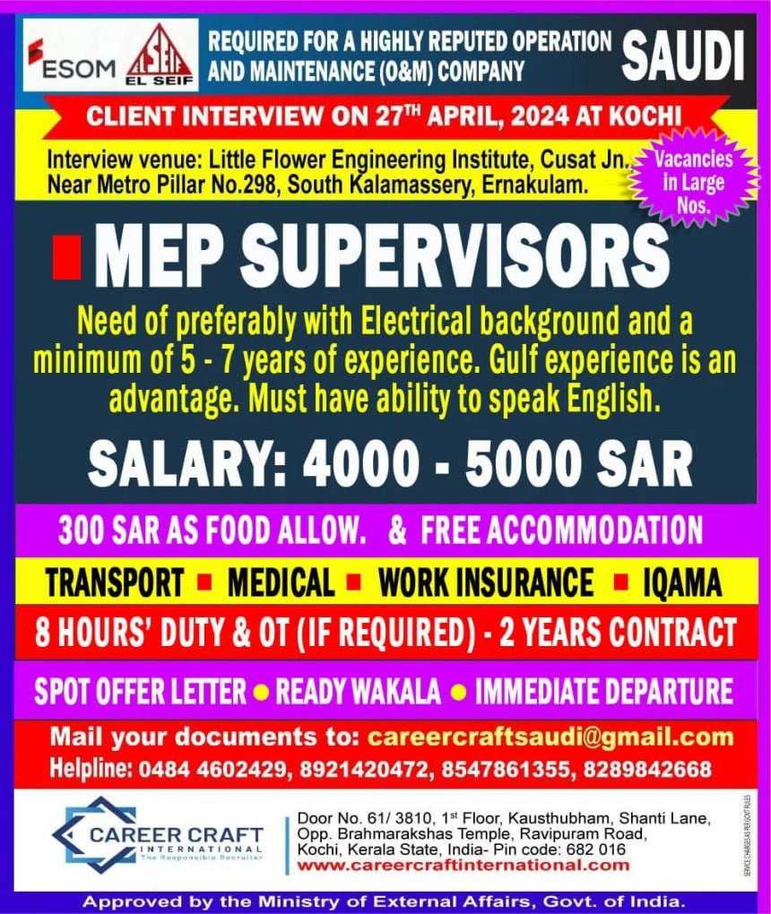 Hiring Mep Supervisors For A Highly Reputed Operation & Maintenance