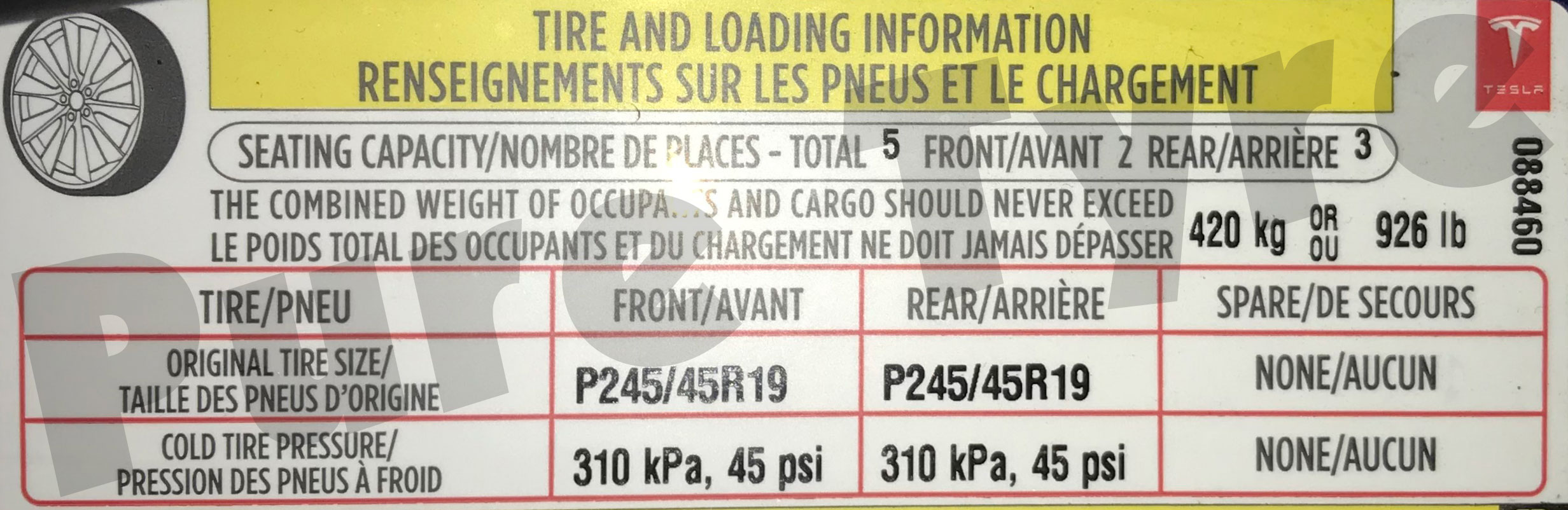 TeslaModelSTyrePressurePlacard24545R19 Pure Tyre 01603 462959