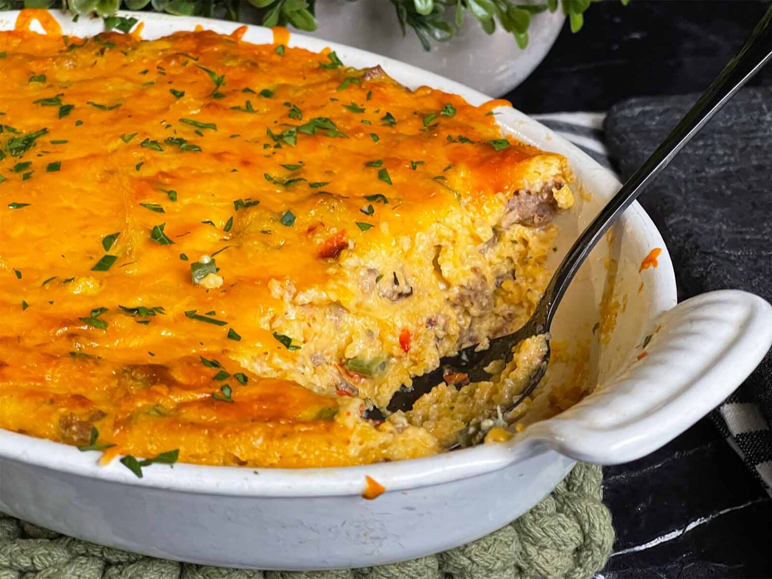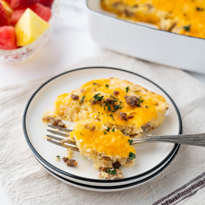 Cheese Grits Casserole Learn how to make cheddar cheese grits casserole. The secret ingredient isn't the eggs, the bacon, or even the grits! This grits casserole made with sausage, grits, and cheddar cheese is ready in an hour and can be kept warm in a slow cooker at your breakfast buffet. It’s hearty and creamy, with a silky texture that’s not too heavy. Cheese Grits Casserole.