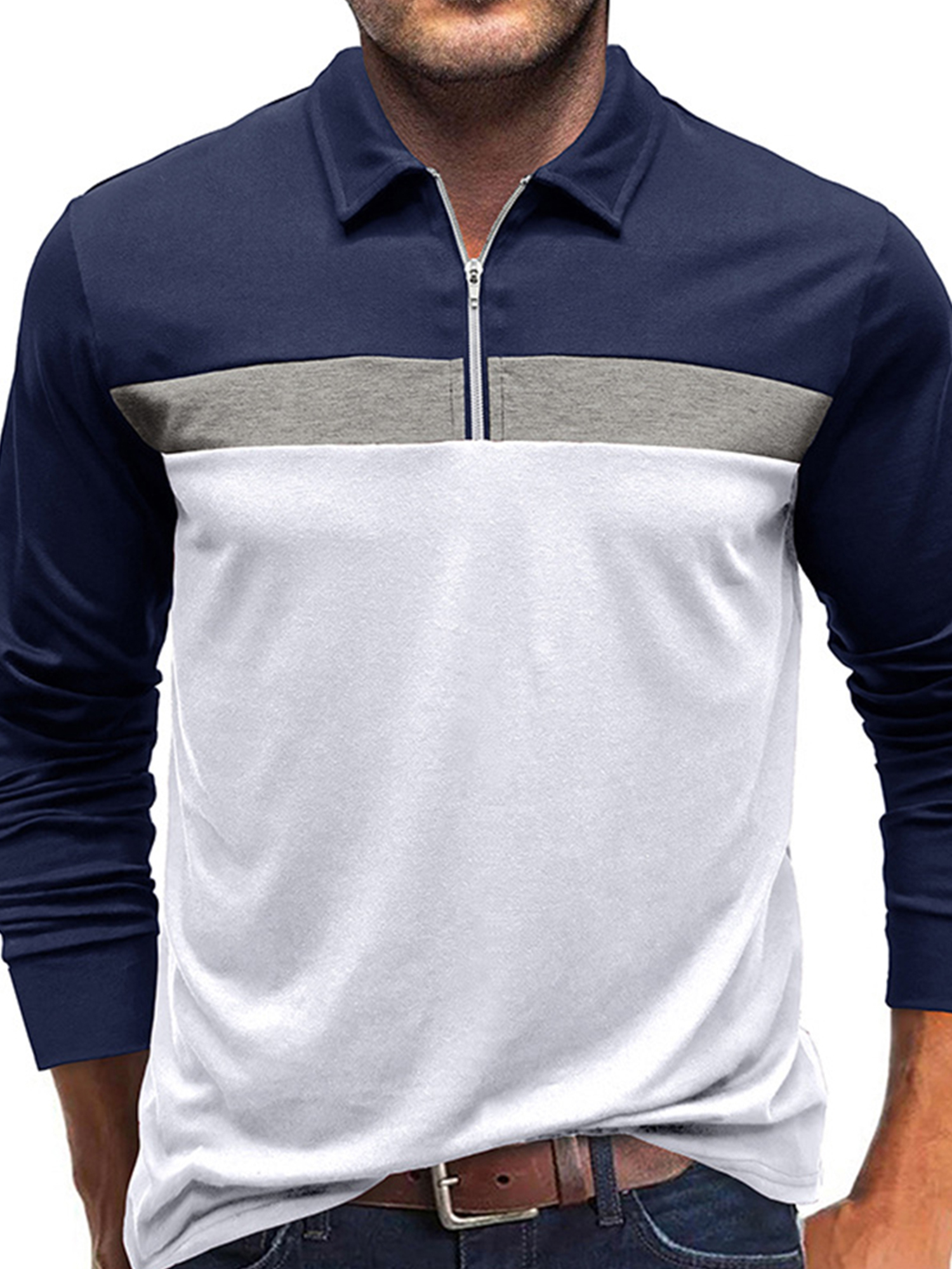 Keeccty Men's Fashion Color Contrast Long Sleeve Zipper Henley Lapel T