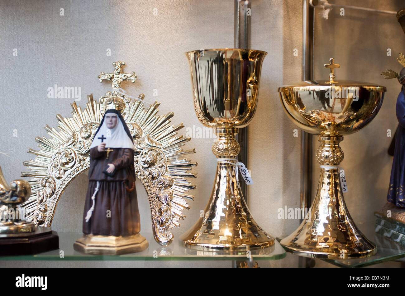 Liturgical objects at a religious goods store in Seville Stock Photo
