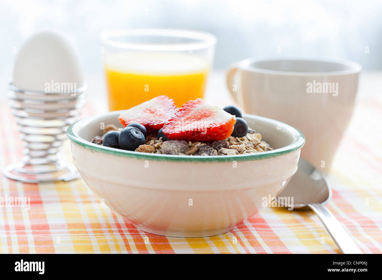 Bowl of muesli with strawberries and blueberries, boiled egg, orange