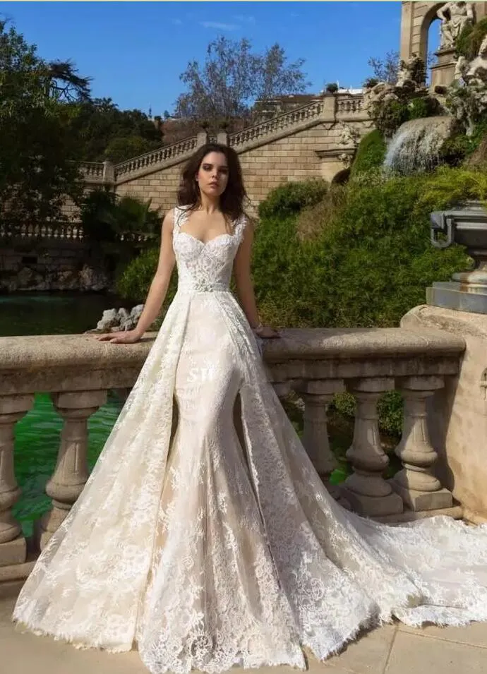 New 2020 Champagne Tulle Lace Wedding Dresses Detachable Train Sweetheart Trumpet Wedding Gowns
