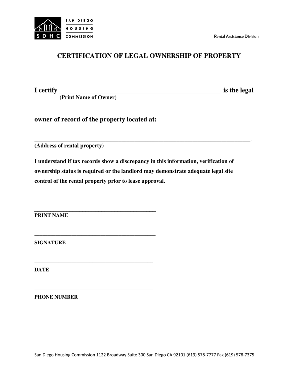 City of San Diego, California Certification of Legal Ownership of