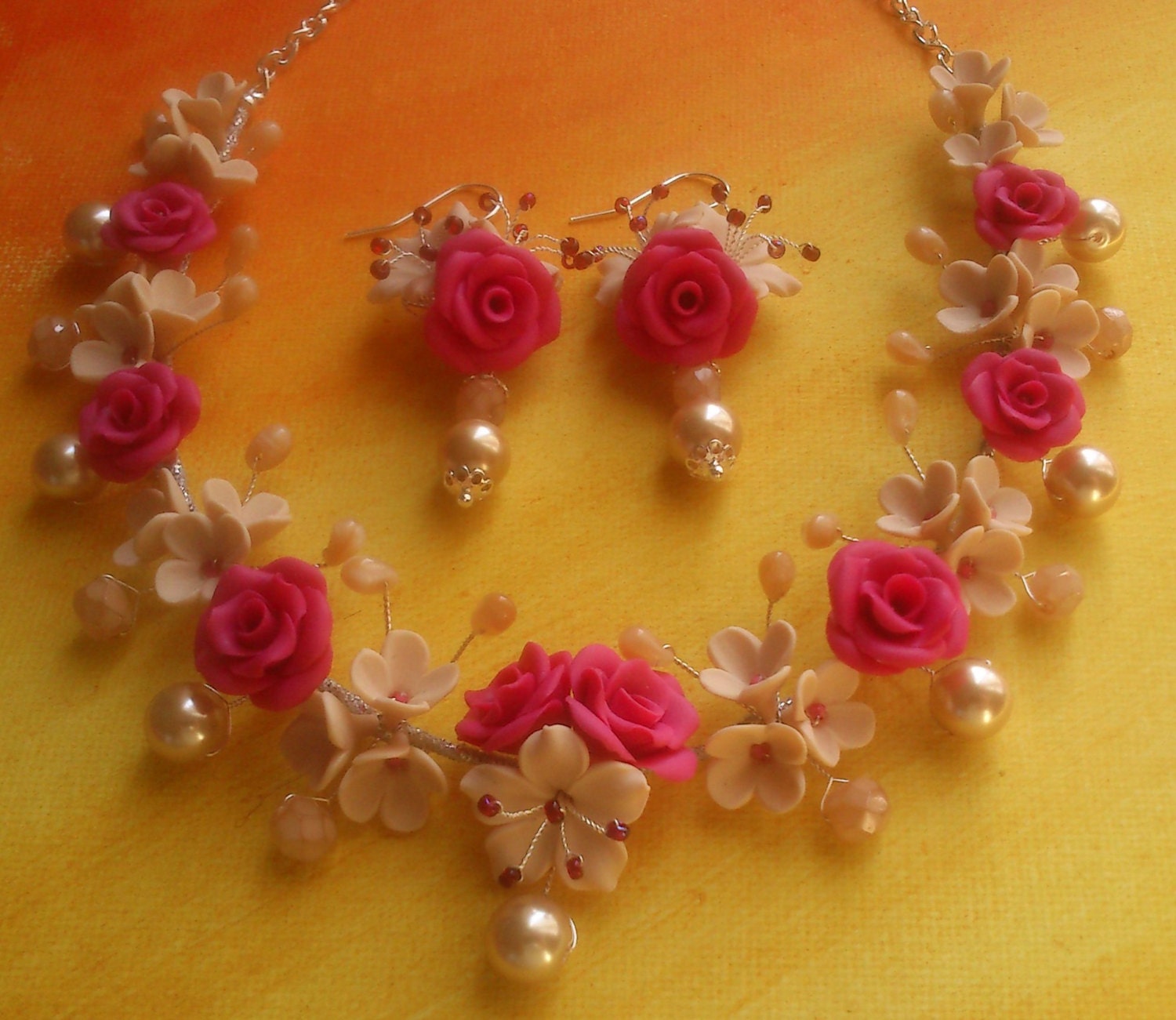 Fuchsia and beige jewelry set Floral jewelry by insoujewelry