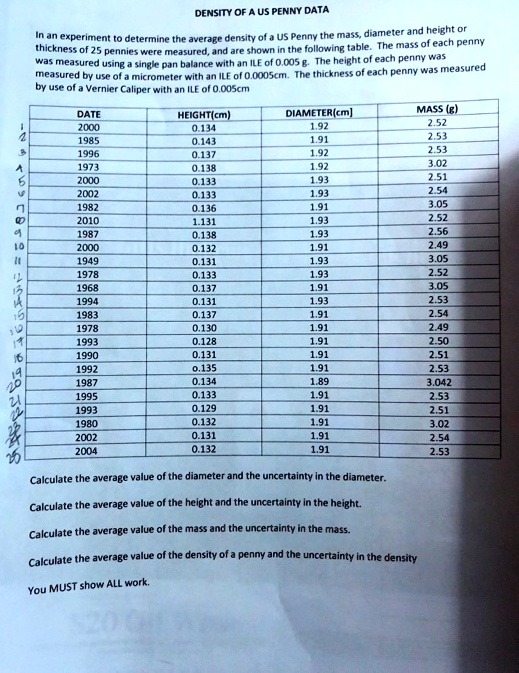 SOLVED DENSITY OF PLMNT DATA und density of & US Penny the mass