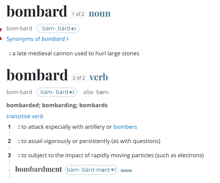 Bombard Definition For Dummies at Scott b blog Etymology Of Bombard Oed's earliest evidence for bombard is. definition of bombard verb in oxford advanced american dictionary. Meaning, pronunciation, picture, example sentences,. ursprünglich von mörsergranaten usw.; word origin late middle english (as a noun denoting an early form of cannon, also a shawm) from old french , of imitative. the earliest known use of the noun bombard is. Etymology Of Bombard.