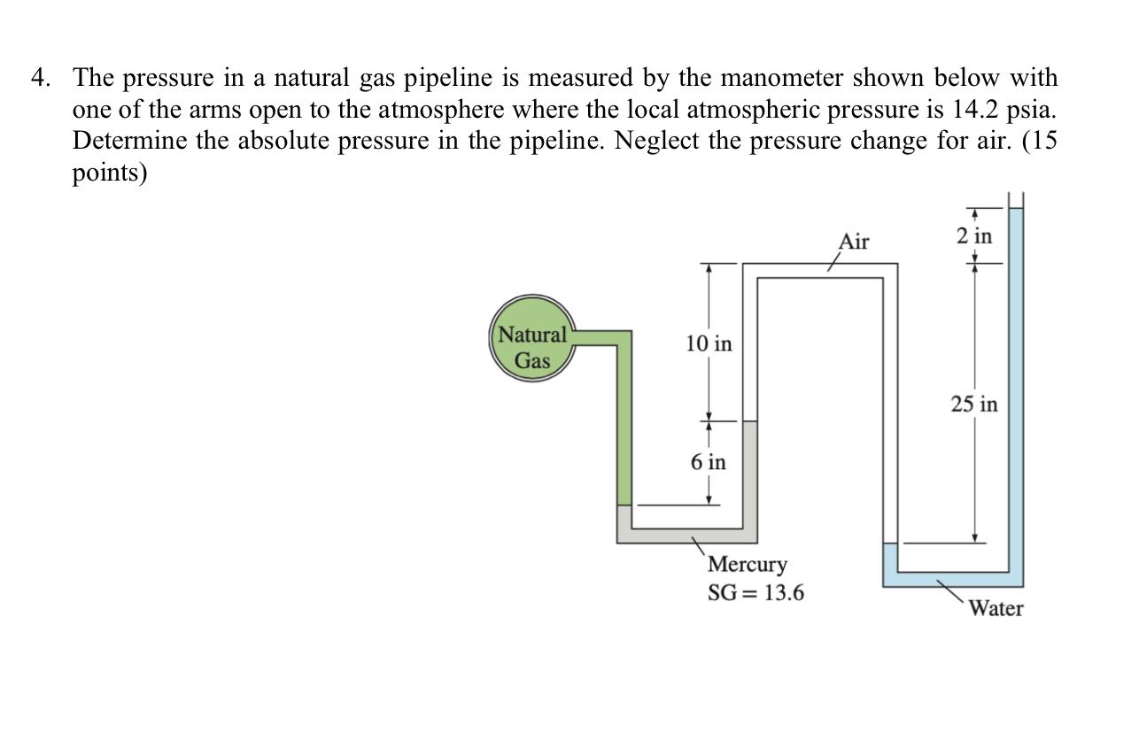 Solved The pressure in a natural gas pipeline is measured by Absolute Pressure Of Pipe Absolute pressure is the sum of gauge pressure and atmospheric pressure. Absolute pressure is the sum of gauge pressure and atmospheric pressure. For reasons we will explore later, in most cases the absolute pressure in fluids cannot be negative. Absolute pressure is the sum of gauge pressure and atmospheric pressure. For reasons we will explore later, in most cases the. Absolute Pressure Of Pipe.