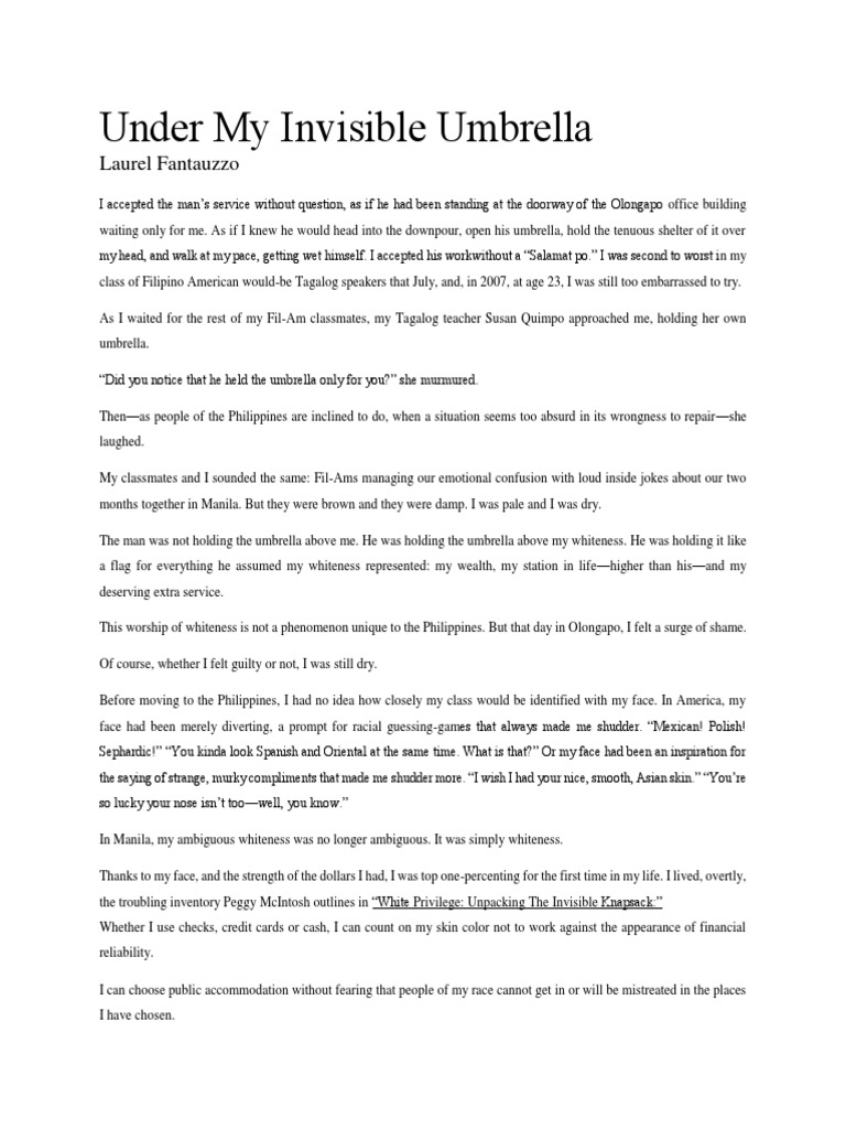 Under My Invisible Umbrella PDF Narration Essays Under My Invisible Umbrella Meaning It’s an assertion of individuality against the homogenizing effect of societal standards. The document analyzes laurel fantauzzo's short story under my invisible umbrella, which discusses issues of colorism and economic inequality in the philippines. Under my invisible umbrella by laurel fantauzzo. Under this umbrella, the protagonist finds his place of exile, a sacred space where he can bask in the. Under My Invisible Umbrella Meaning.