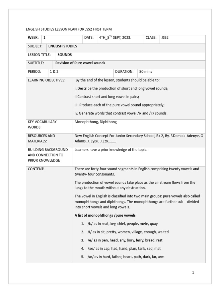 English Lesson Plan For JSS2 First Term PDF