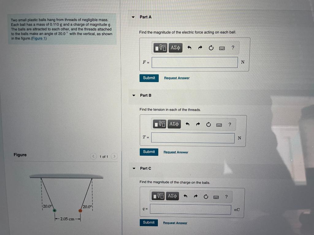 Solved Part A Two small plastic balls hang from threads of Two Small Plastic Balls Hang From Threads Of Negligible Mass Each ball has a mass of 0.180 g and a charge of magnitude g. Two small plastic balls hang from threads of negligible mass. Each ball has a mass of 0.240 g and a charge of. Each ball has a mass of 0.250 g and a charge of magnitude q. two small plastic balls hang from threads of negligible. Two Small Plastic Balls Hang From Threads Of Negligible Mass.