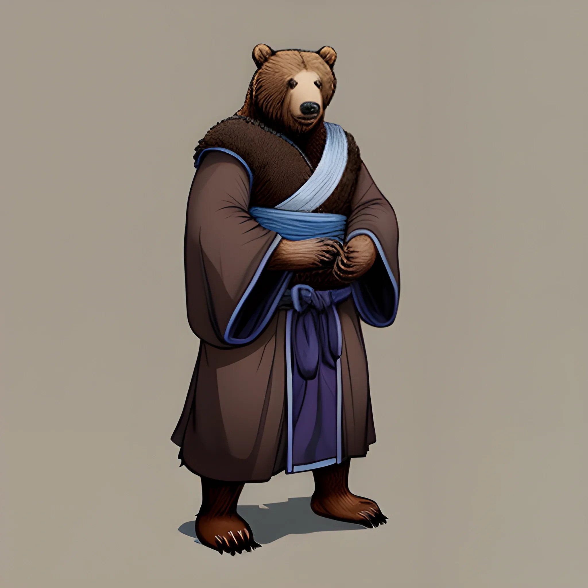fluffy brown bear wearing dark blue monk robe, dnd artstyle Arthub.ai