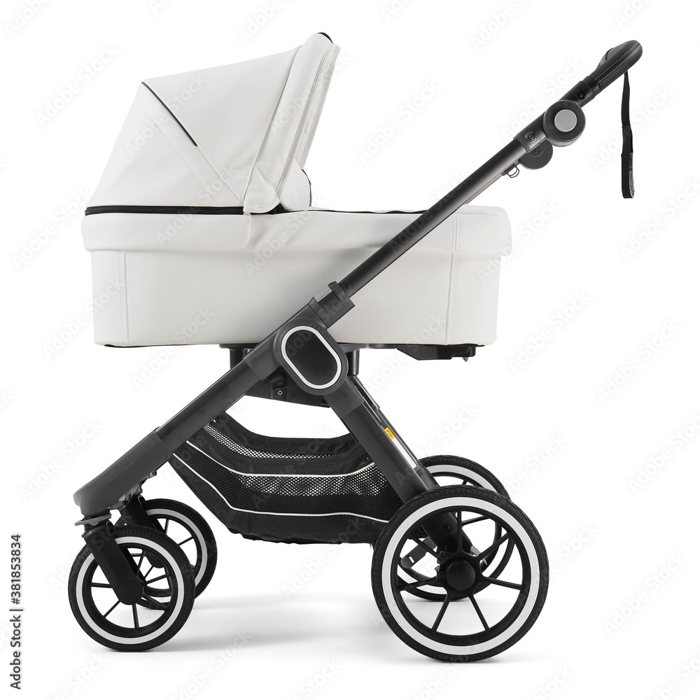 Black & White Baby Pram Stroller Isolated on White. Pushchair and
