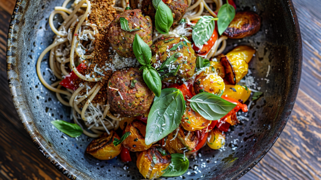 Spaghetti with Meatballs and Roasted Veggies The Vegan Taste