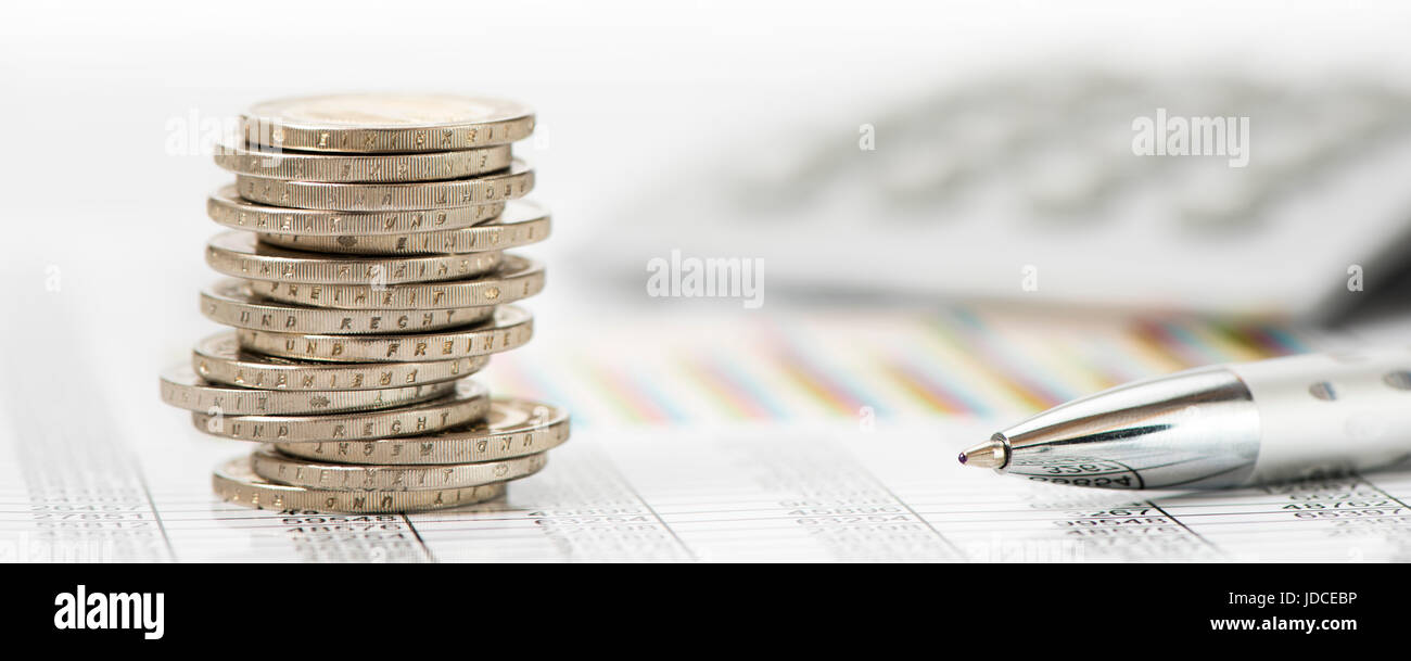 stacked coins over data of stock market with calculator Stock Photo Alamy