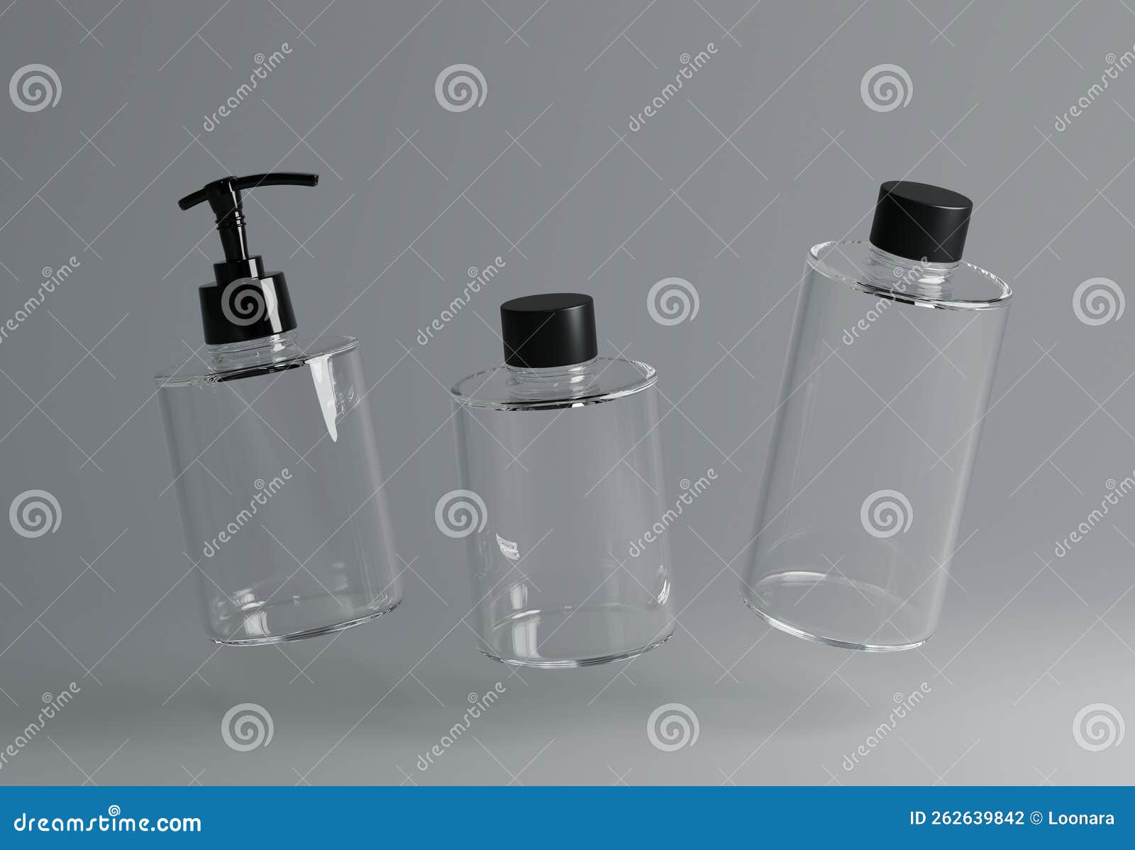 Three Different Clear Plastic Cosmetic Product Floating Bottles Set Template on Gray Background