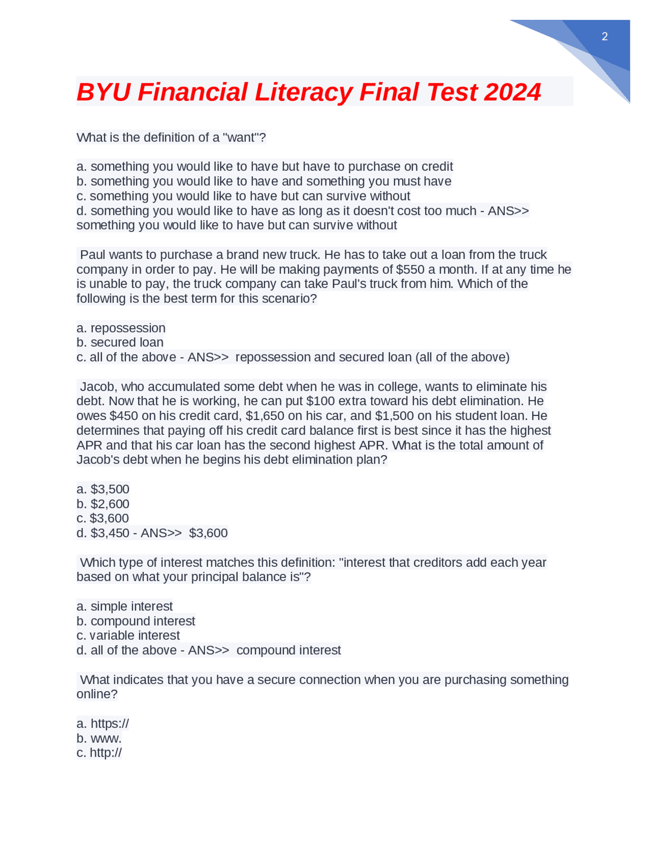 BYU Financial Literacy Final Test 2024. Exams Financial Management